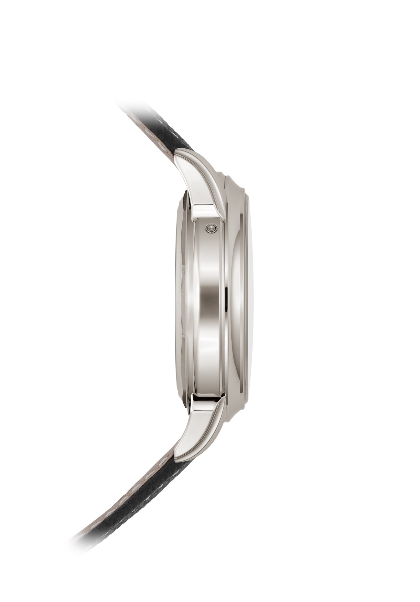 Platino. Diamante incastonato a ore 6. Diametro: 41 mm. Spessore: 12,4 mm. Impermeabile fino a 30 m. Fondello in vetro zaffiro.