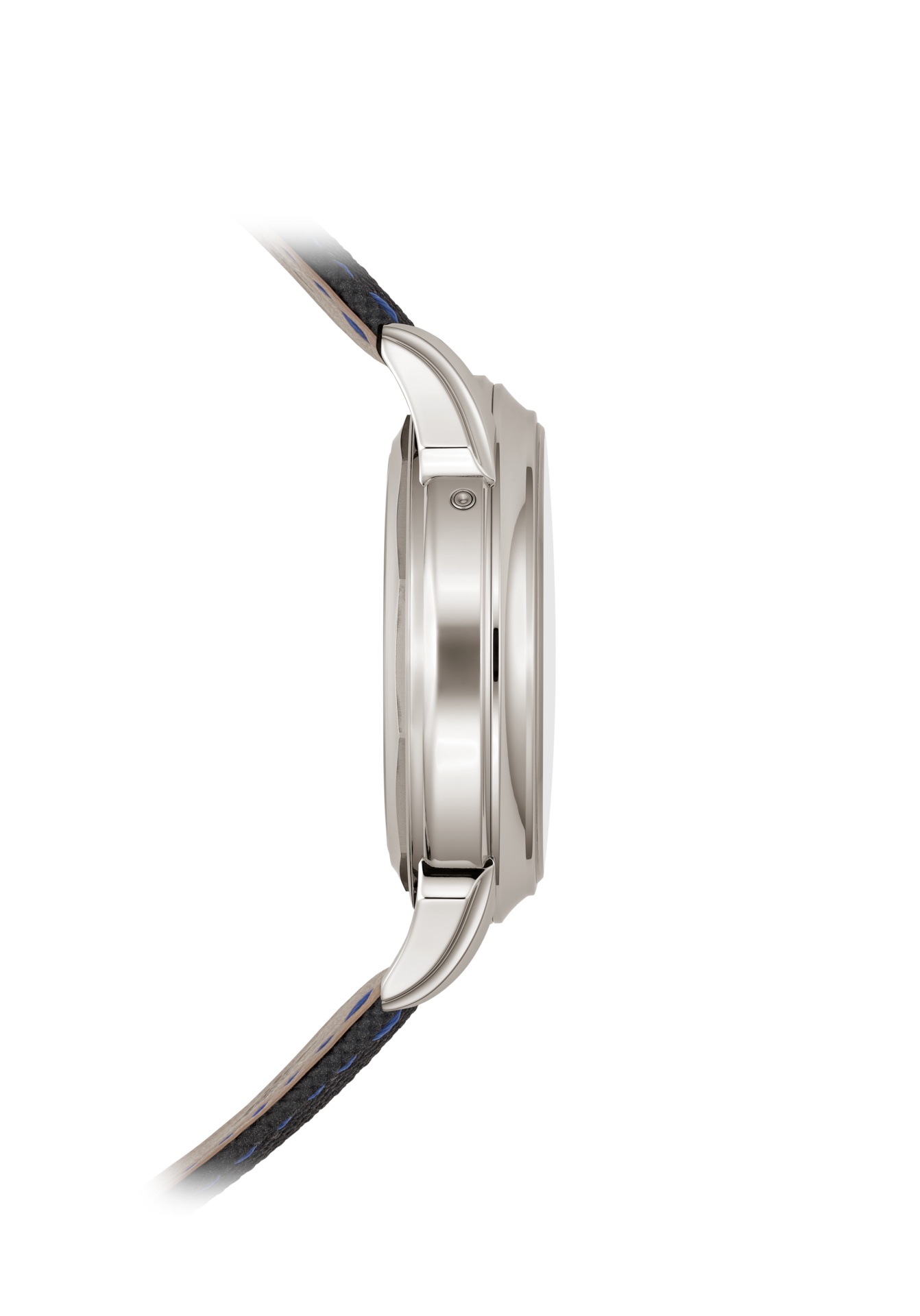 Platino. Diamante incastonato a ore 6. Diametro: 41 mm. Spessore: 12,4 mm. Impermeabile fino a 30 m. Fondello in vetro zaffiro.