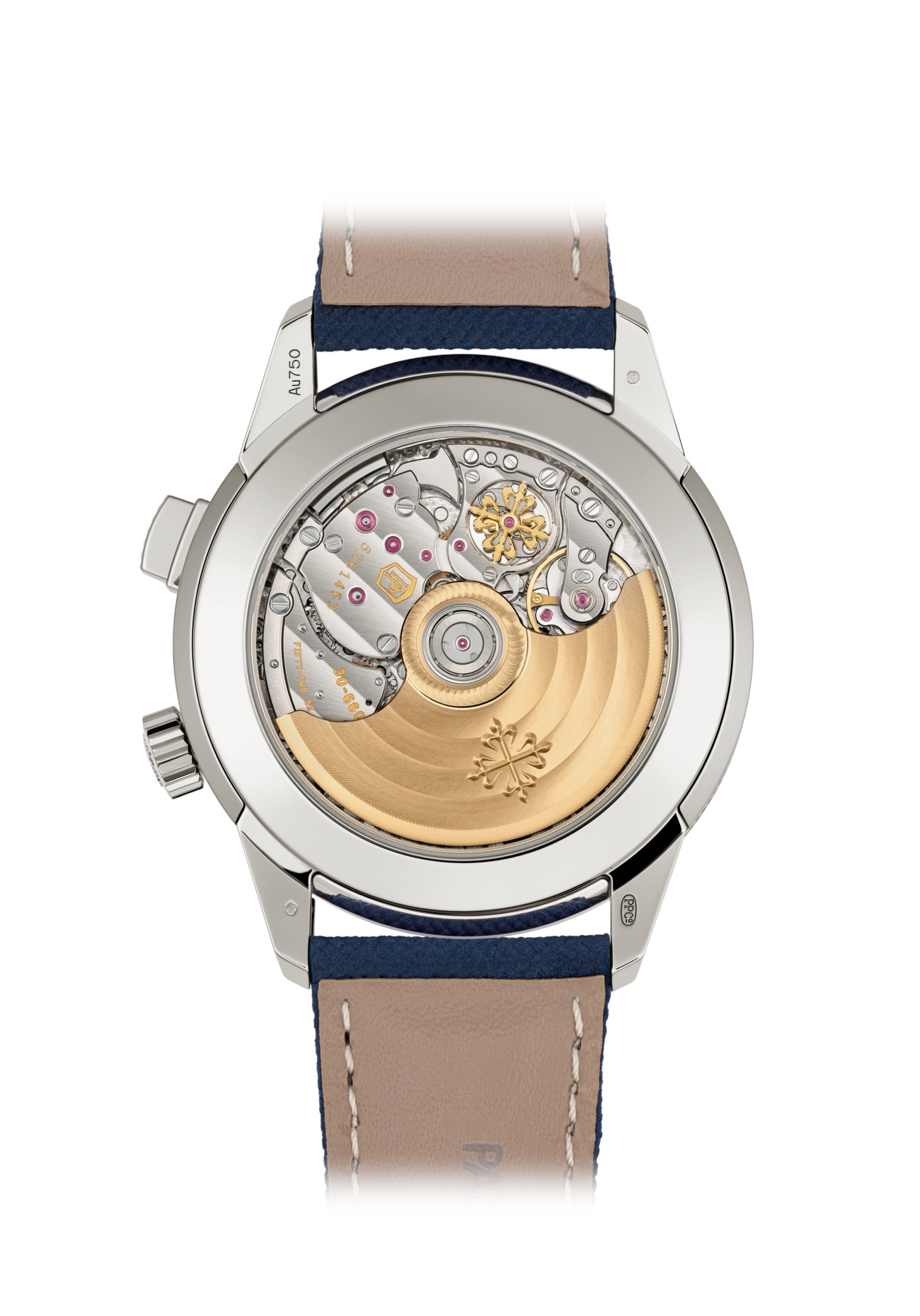 Materiale composito, motivo a trama, blu navy (originale). Pelle di vitello, finitura nabuk, beige (cinturino aggiuntivo). Chiusura a tripla lama ribaltabile in oro bianco verniciato.