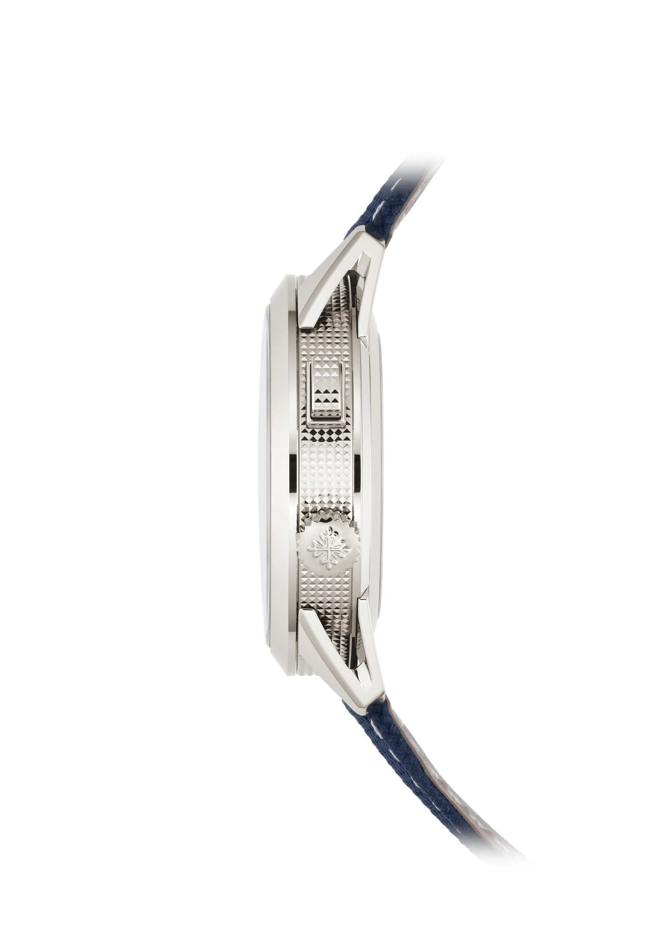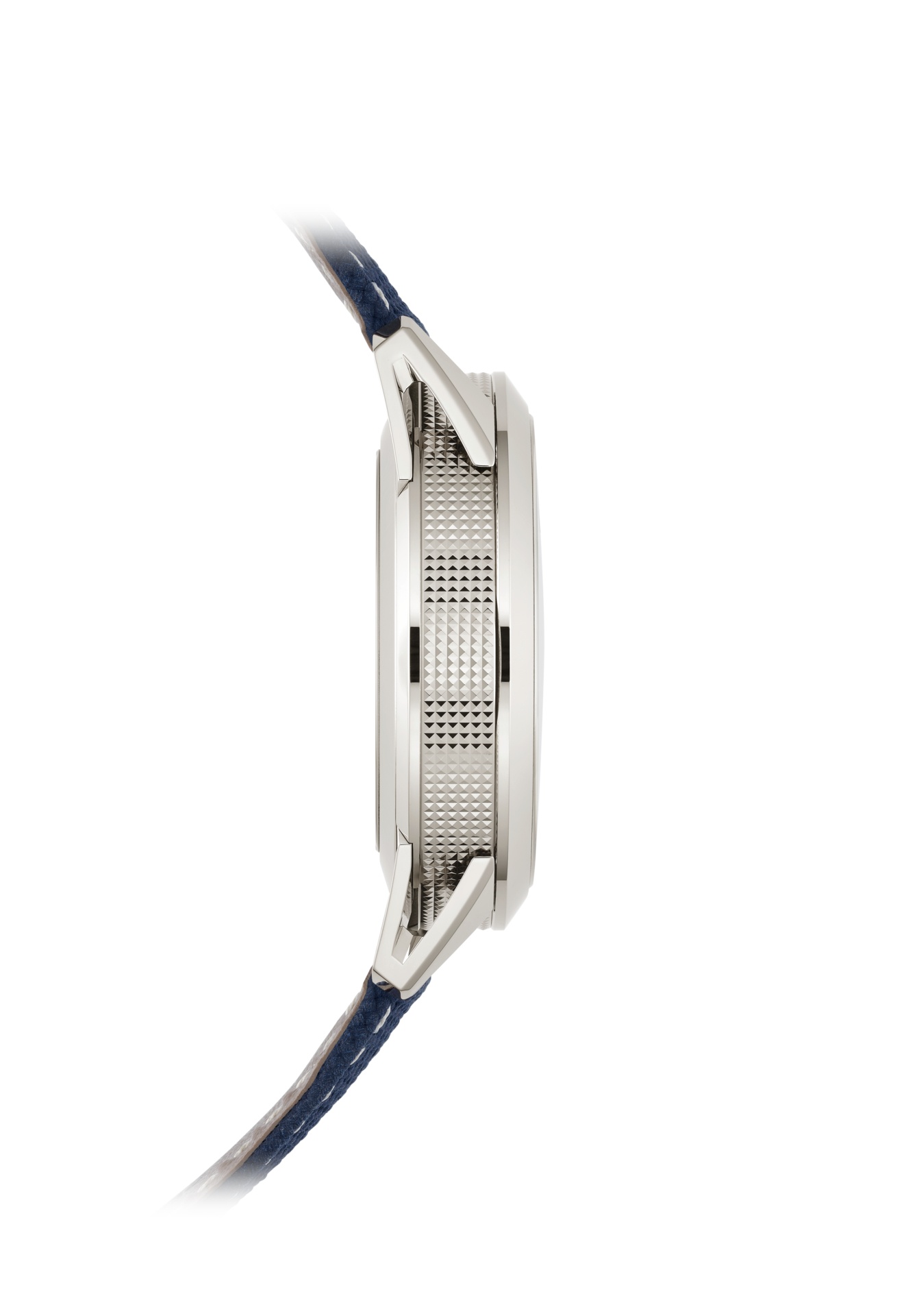 Quadrante blu navy laccato con texture e bordo sfumato nero, indici applicati in oro bianco con rivestimento luminescente bianco. Lancette a forma di siringa in oro bianco con rivestimento luminescente bianco.
