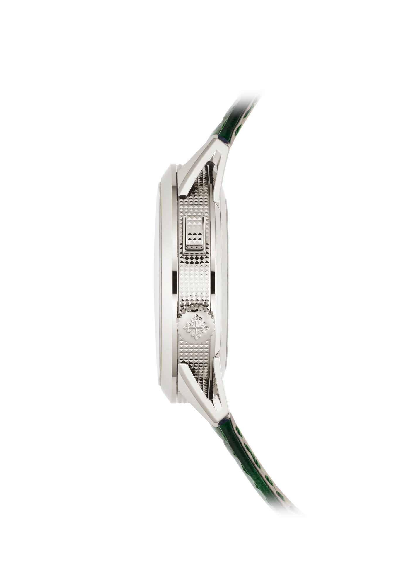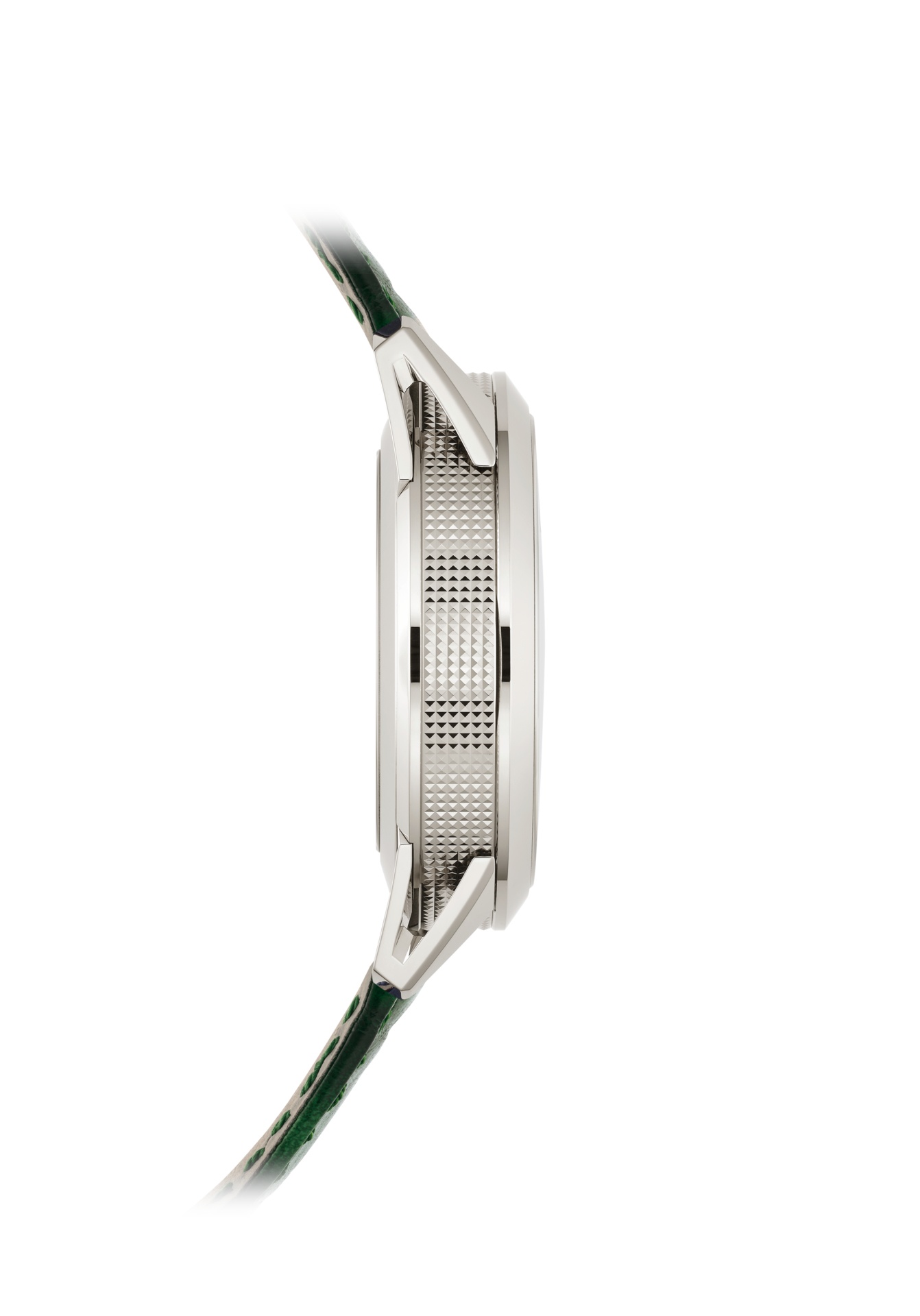 Una Grande Complicazione dotata di una funzione sveglia 24 ore che consente all'utente di impostare la sveglia in modo intuitivo. La cassa in oro bianco con motivo a chiodini incornicia un quadrante laccato verde con texture di eccezionale raffinatezza. La funzione sveglia del calibro a carica automatica AL 30-660 S C emette un suono elegante, grazie a un unico martello che percuote un classico gong.
