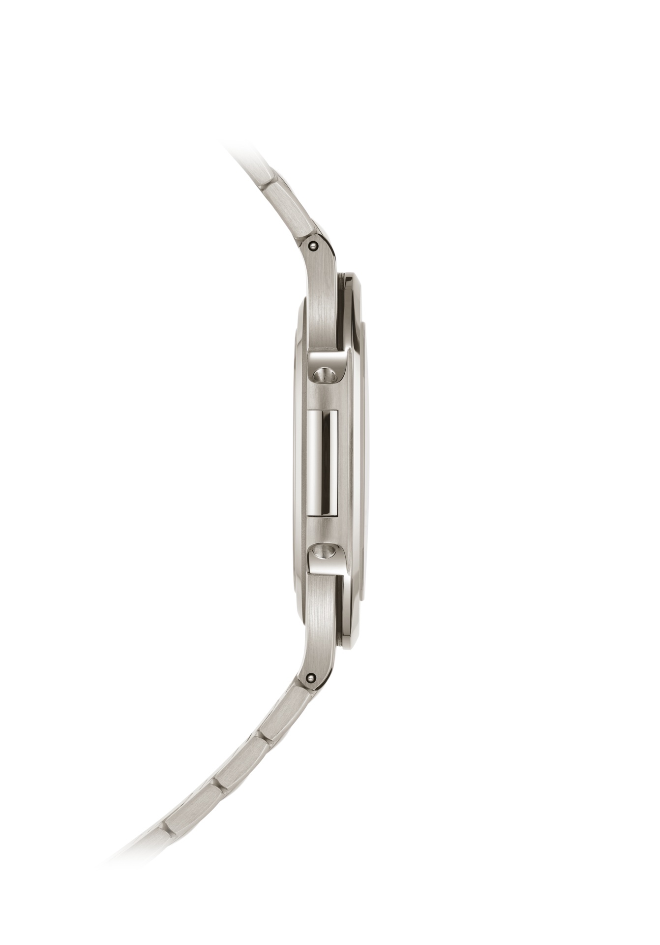 Oro bianco. Diametro (tra le ore 10 e le 4): 41 mm. Spessore: 6,9 mm. Impermeabile fino a 30 m. Corona a vite. Fondello in vetro zaffiro.