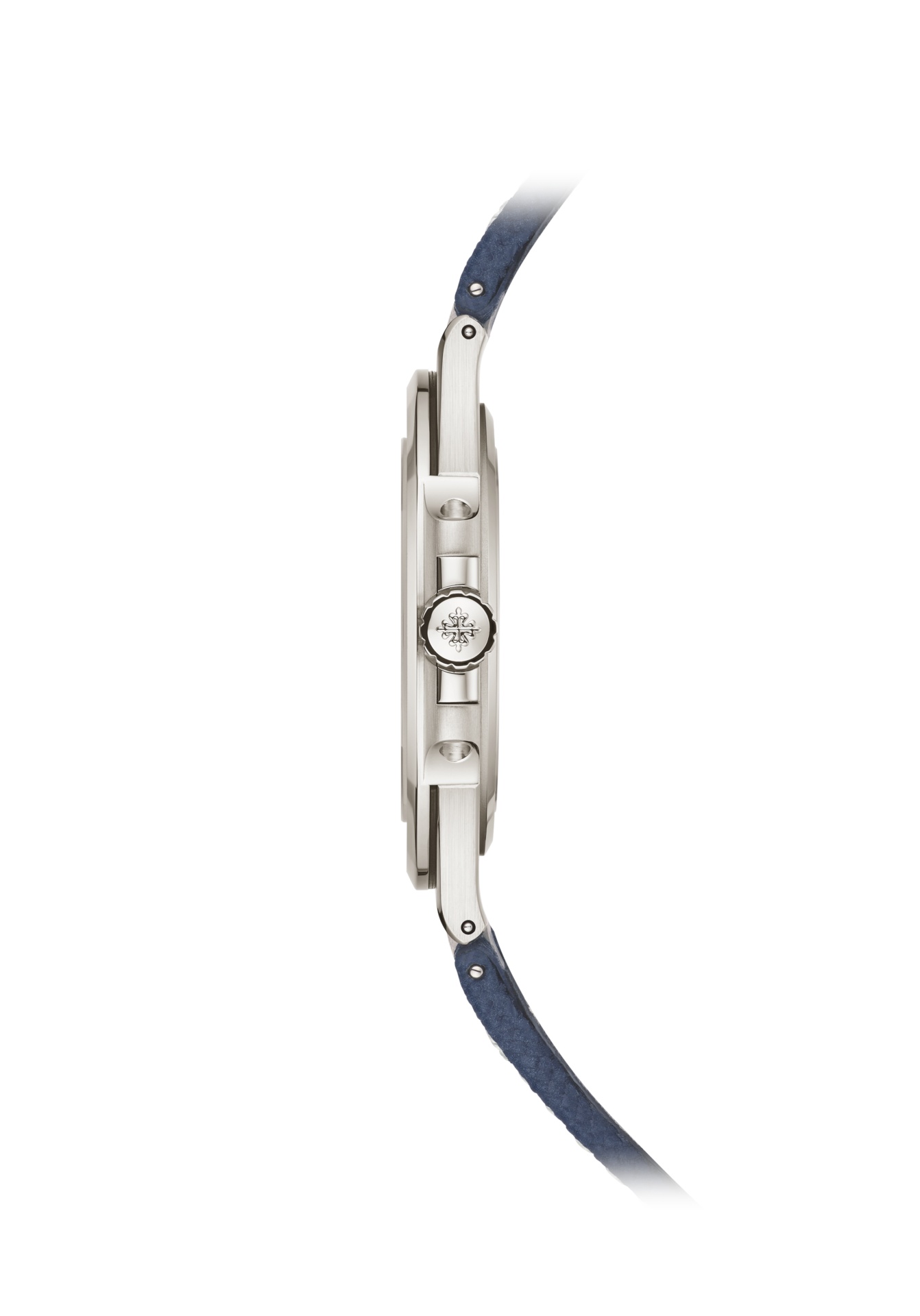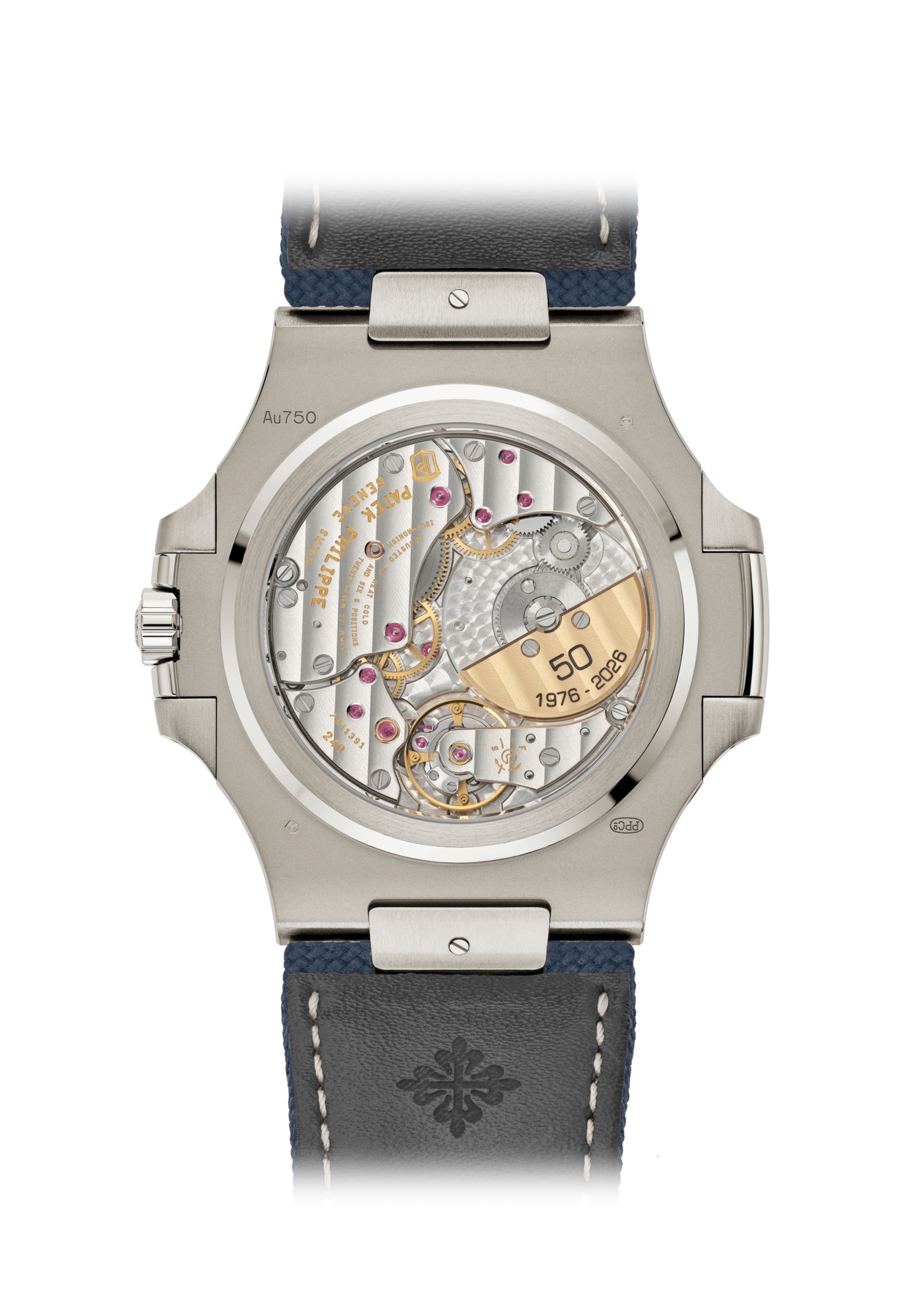 In occasione del 50° anniversario della collezione, la Manifattura rivisita il design del Nautilus con questo segnatempo caratterizzato da una cassa ultrapiatta in oro bianco, un quadrante blu con finitura a raggi di sole e un cinturino in materiale composito blu navy con motivo a trama tessuta. L'orologio è animato dal calibro 240 a carica automatica ultrapiatto ed è proposto in un'edizione limitata a 1.000 esemplari.