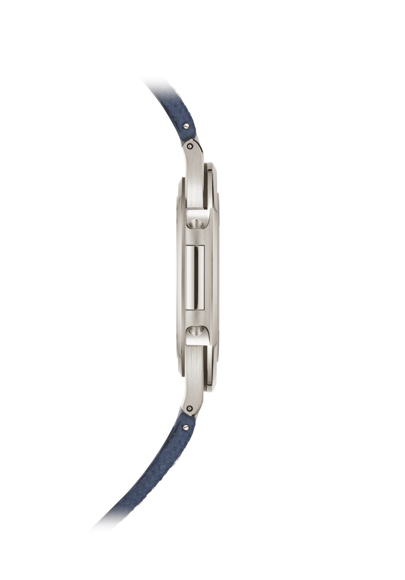Blu sunburst, con motivo goffrato orizzontale, indici applicati in oro bianco con diamanti taglio baguette (0,39 ct). Lancette arrotondate in oro bianco a bastone con rivestimento luminescente bianco.