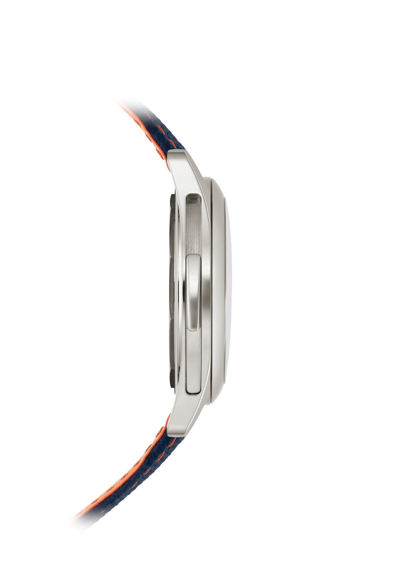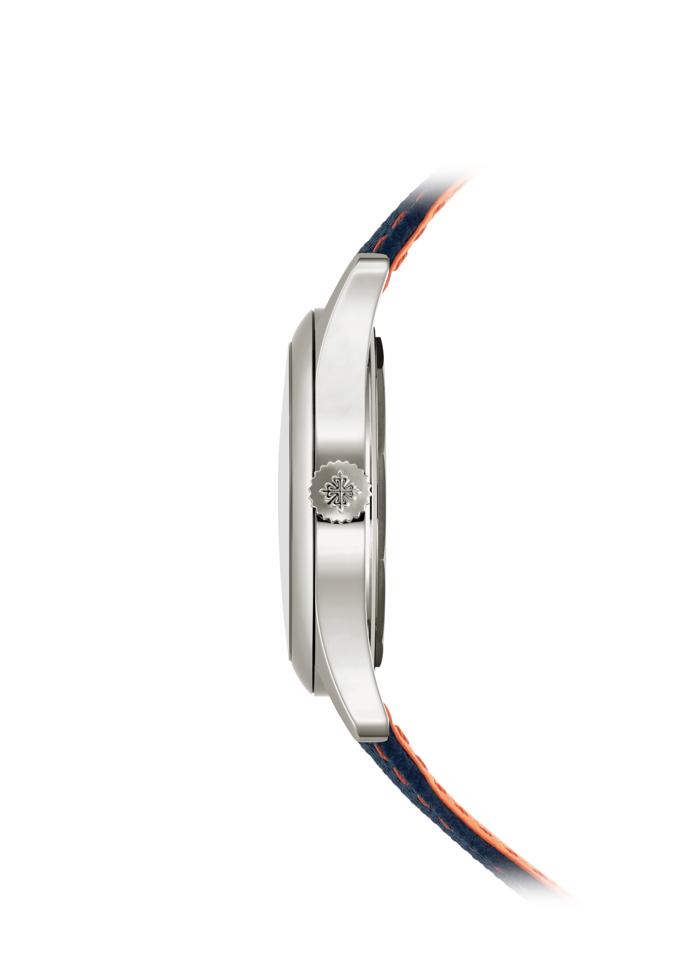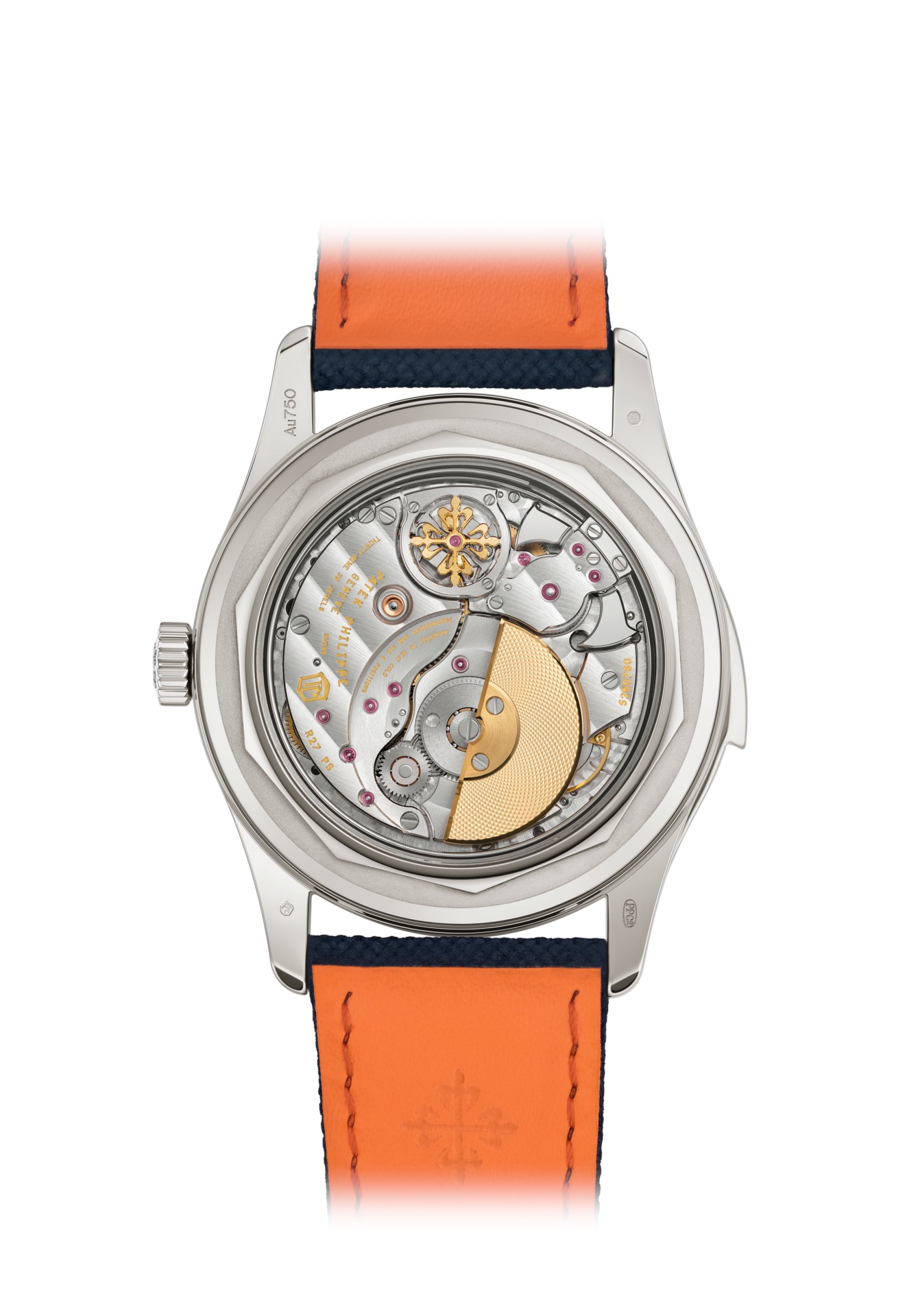 Questo eccezionale segnatempo combina la ripetizione minuti con un design moderno caratterizzato da una cassa in oro bianco e da un quadrante blu navy impreziosito da un motivo in carbonio goffrato al centro. Questo stile dinamico è esaltato dal tocco cromatico a contrasto dato dalla lancetta dei piccoli secondi verniciata in arancione, dagli indici triangolari applicati in arancione e dalle cuciture e dalla fodera arancioni del cinturino composito blu navy con motivo tessuto.