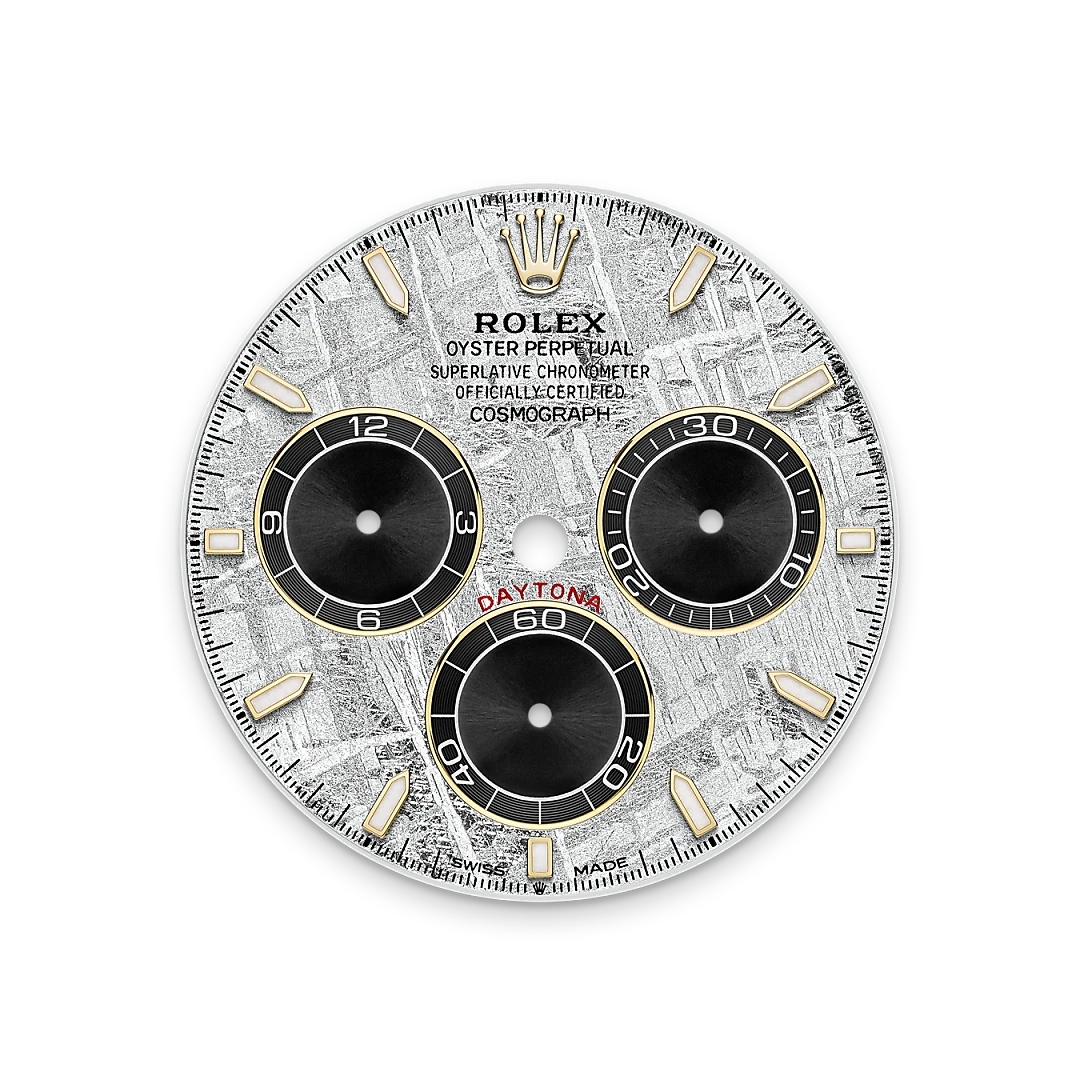 Nel corso del suo viaggio, il cuore della meteorite subisce una trasformazione graduale che dà vita a motivi metallici estremamente inusuali, frutto del lentissimo processo di raffreddamento del nucleo fuso degli asteroidi. A partire da queste configurazioni, i designer del Marchio hanno creato un quadrante unico per alcuni dei modelli più prestigiosi, tra cui questo Cosmograph Daytona.