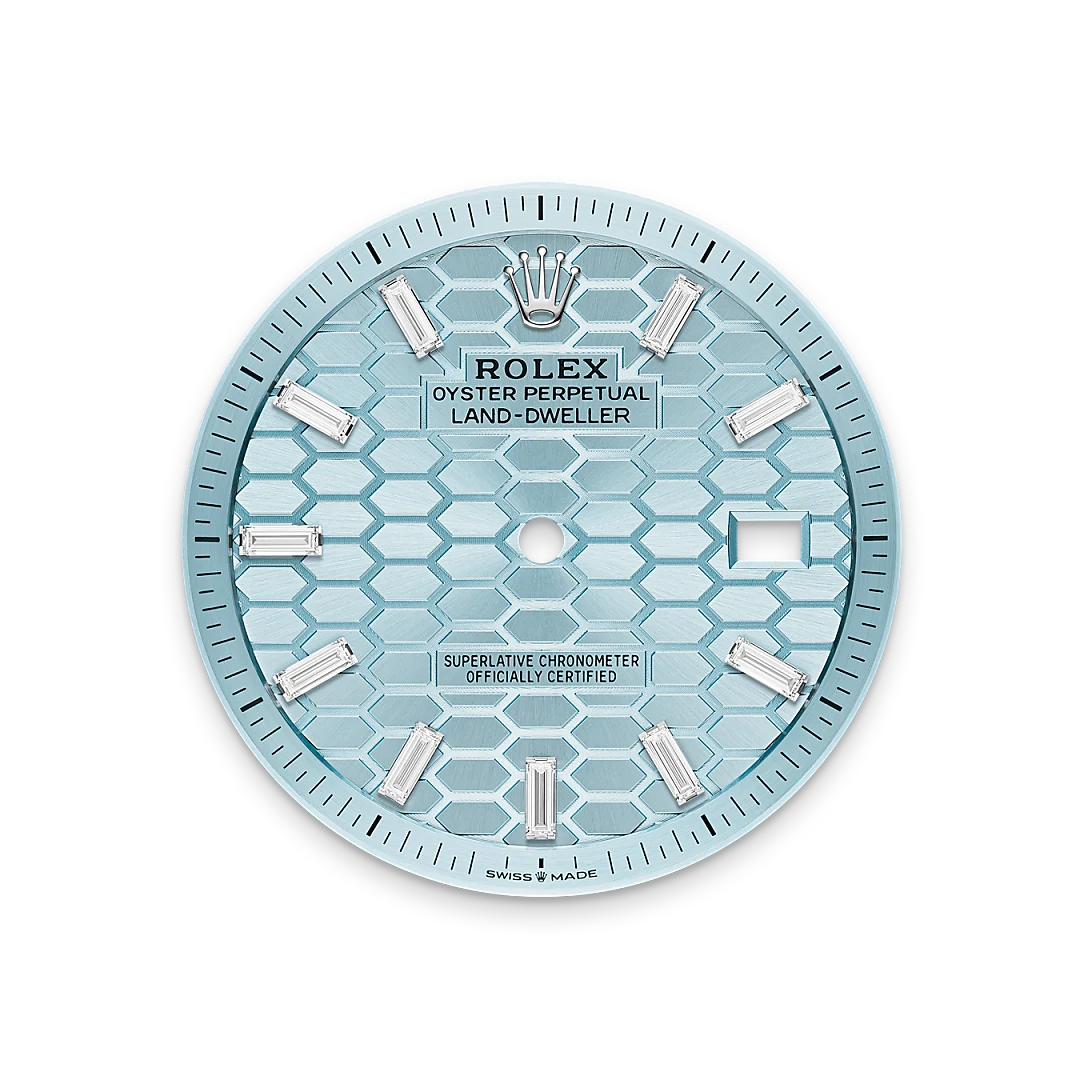 Raro e prezioso, il platino si distingue per il suo candore argenteo e per la sua vibrante luminosità. È uno dei metalli più densi e più pesanti al mondo, caratterizzato da proprietà fisiche e chimiche eccezionali, come una straordinaria resistenza alla corrosione. Paradossalmente è anche duttile, elastico e altamente malleabile, ragion per cui la lavorazione e la lucidatura risultano essere operazioni molto delicate che richiedono competenze estremamente elevate. Rolex usa esclusivamente platino 950, una lega composta dal 950‰ (per mille) di platino, realizzata in interno grazie al meticoloso lavoro dei tecnici metallurgici della Casa. Il più nobile dei metalli per i segnatempo più raffinati.