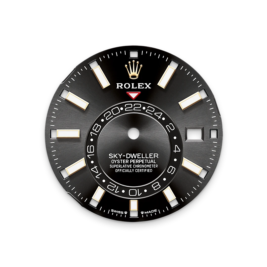 La lunetta zigrinata è un tratto distintivo degli orologi Rolex. La lunetta zigrinata dell’Oyster aveva in origine una funzione: serviva ad avvitarla alla cassa, contribuendo così a garantire l’impermeabilità dell’orologio. La zigrinatura era, di conseguenza, l’esatta riproduzione di quella del fondello che, per le stesse ragioni, veniva avvitato alla cassa con degli appositi strumenti Rolex. Col tempo la zigrinatura si è trasformata in un elemento estetico, un segno distintivo di Rolex disponibile soltanto nelle preziose versioni in oro. Lo Sky-Dweller dispone di un meccanismo di interazione tra la lunetta girevole, la corona di carica e il movimento: il sistema Ring Command, che permette a chi indossa l’orologio di selezionare di volta in volta le funzioni e di regolarle in modo semplice, rapido e sicuro.