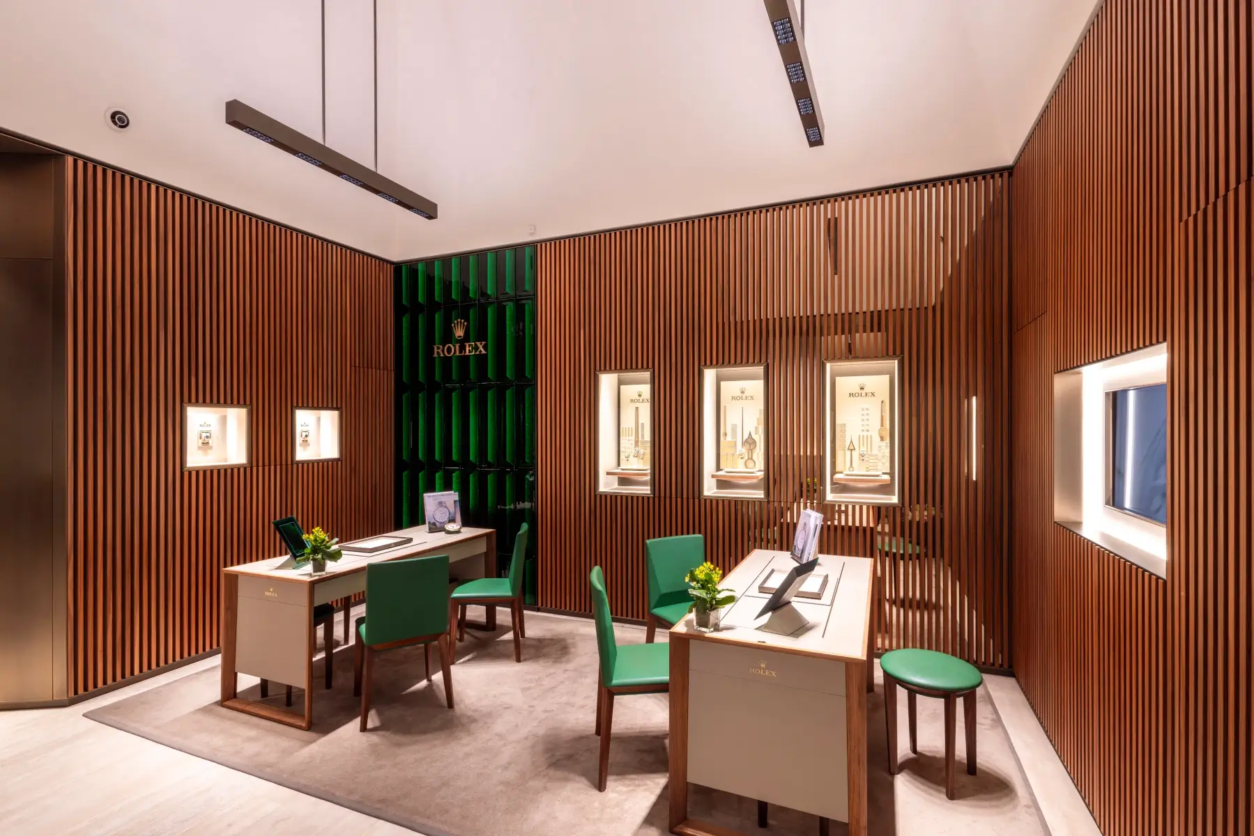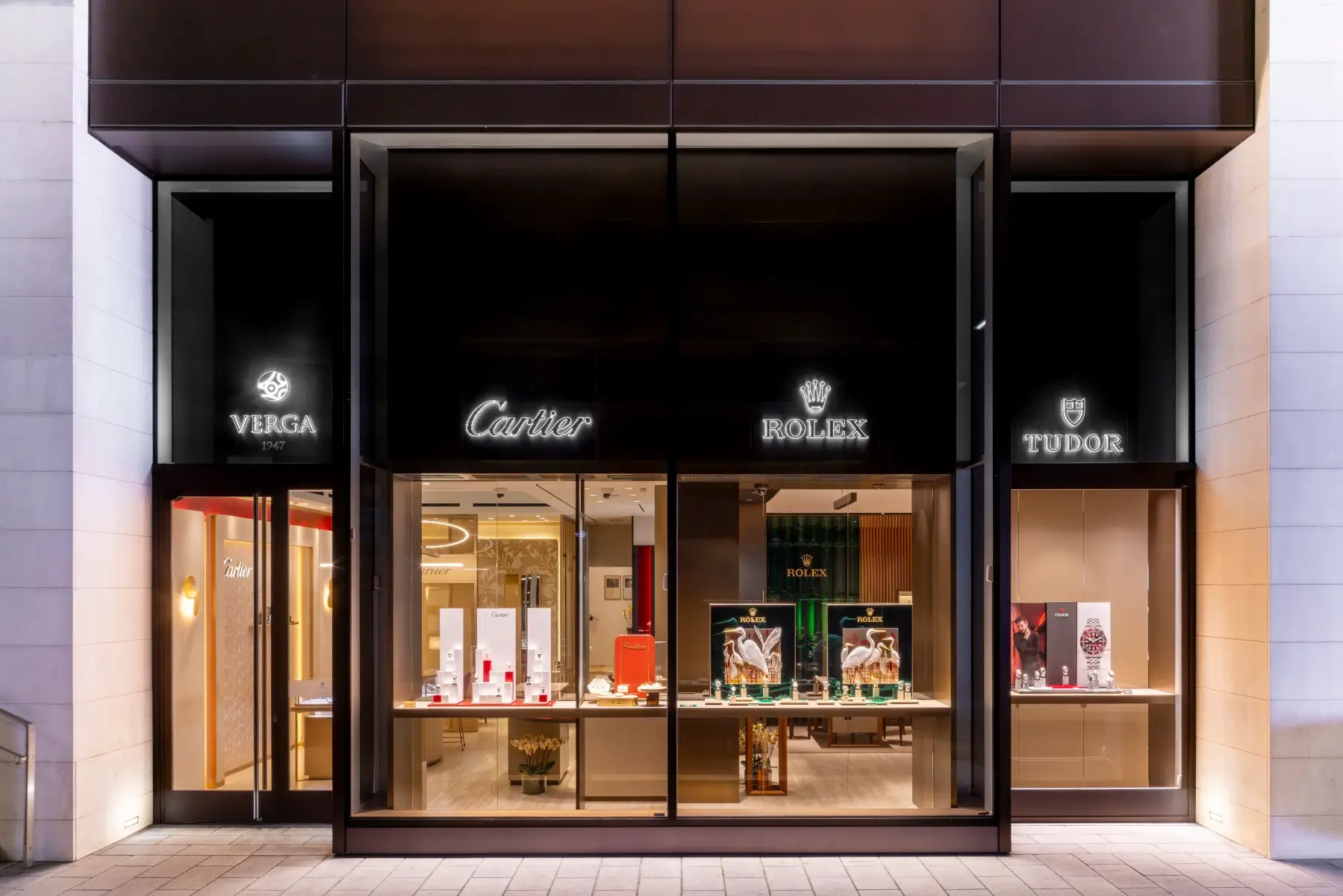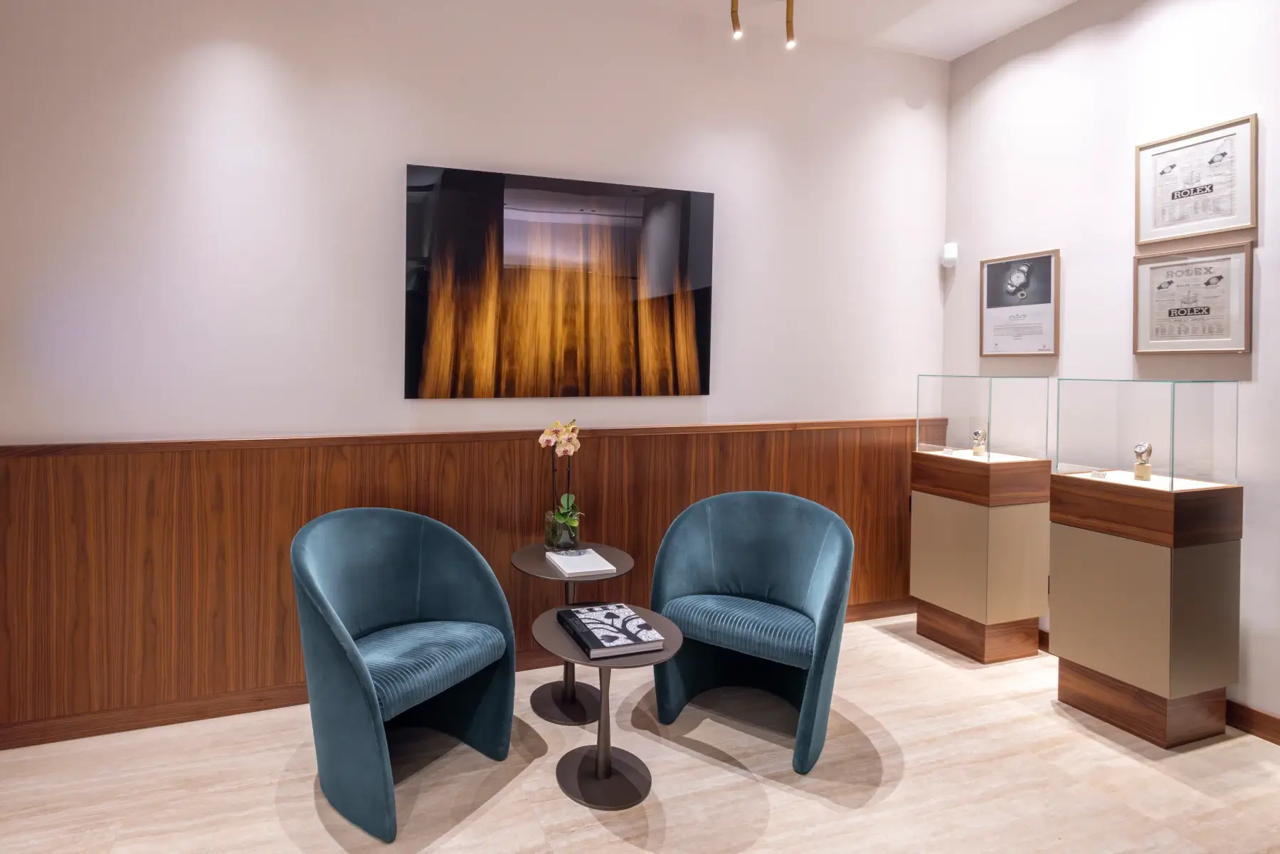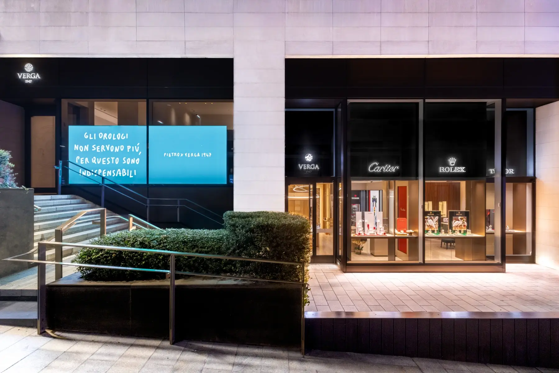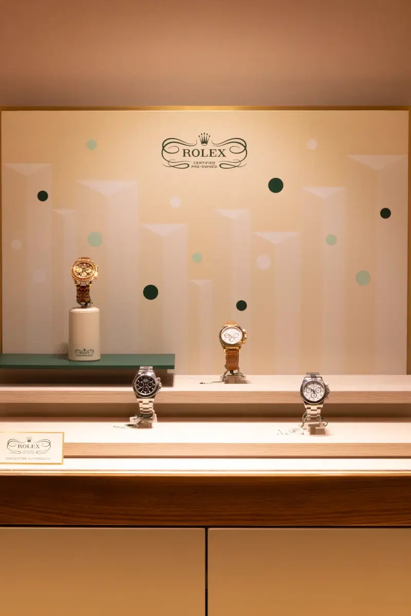 Easily recognizable by its imposing windows and high ceilings, the shop extends over a space of approximately 120 m2 and is characterized by two large open-space exhibition areas dedicated to the sale of the Rolex, Cartier, Tudor and Pomellato jewelery brands.