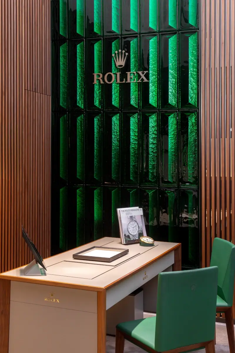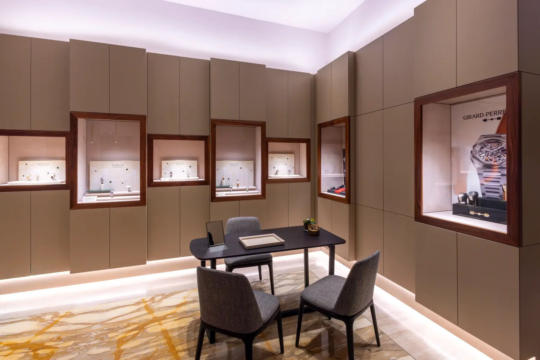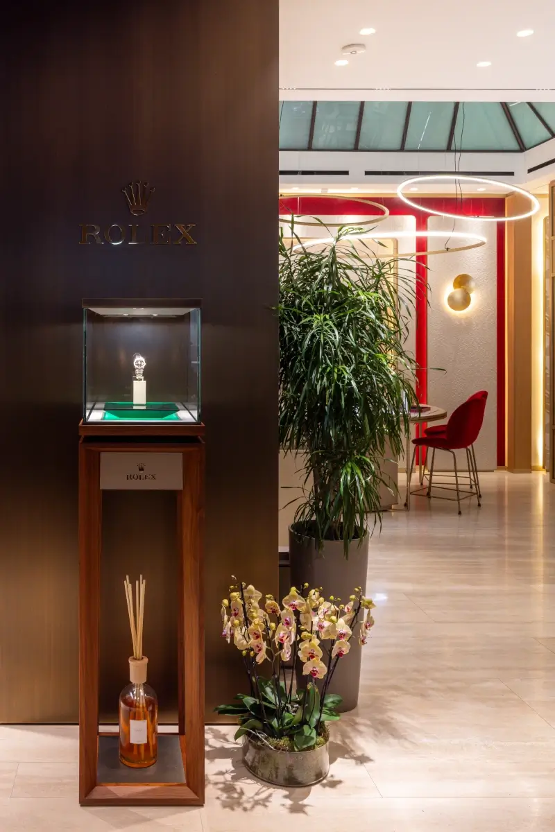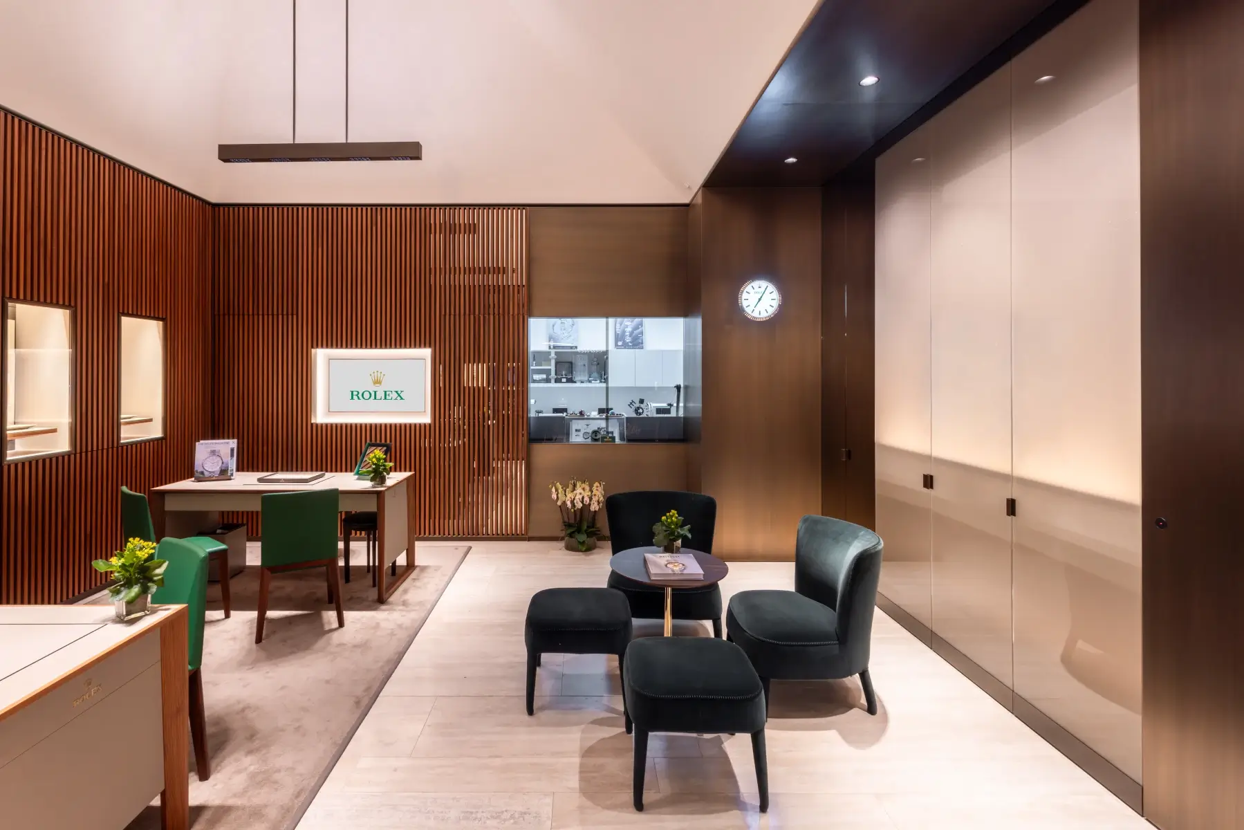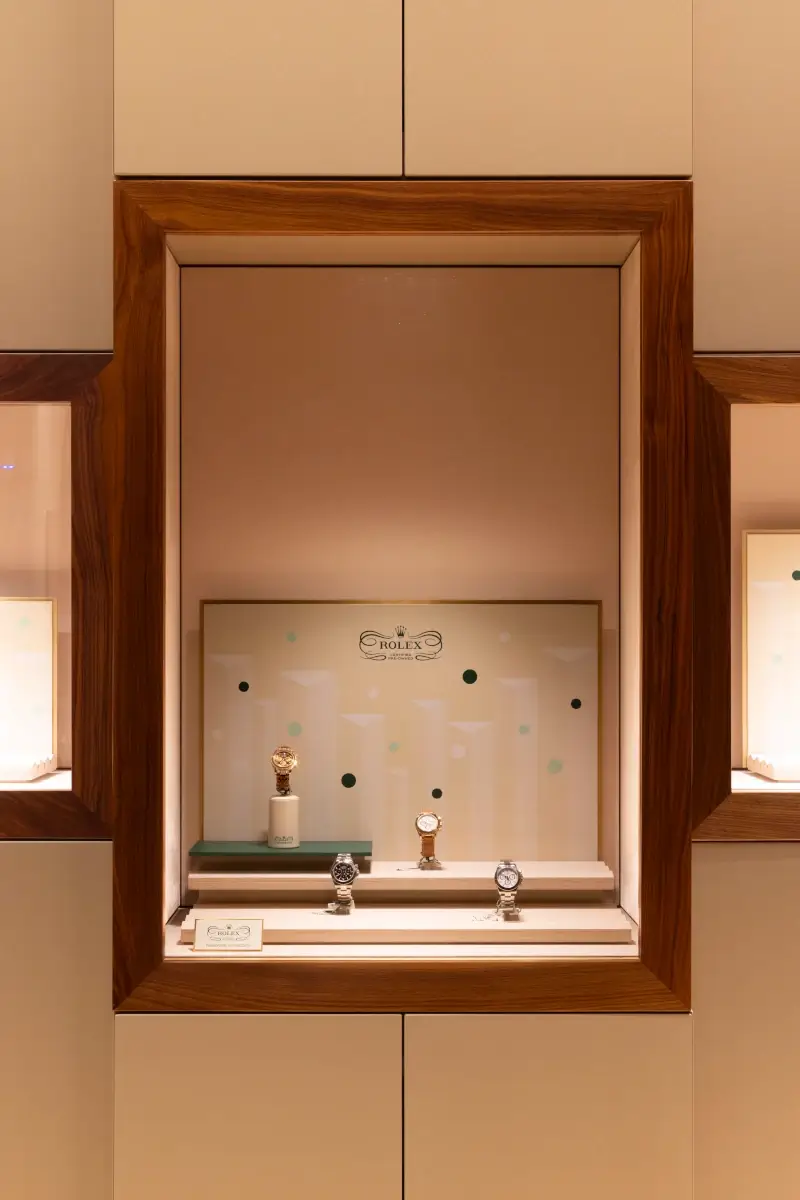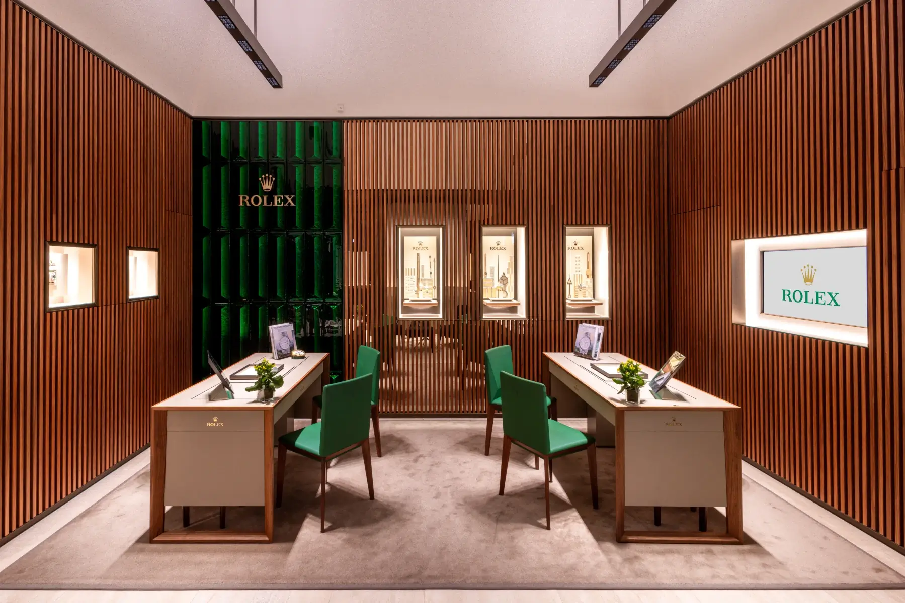 Easily recognizable by its imposing windows and high ceilings, the shop extends over a space of approximately 120 m2 and is characterized by two large open-space exhibition areas dedicated to the sale of the Rolex, Cartier, Tudor and Pomellato jewelery brands.