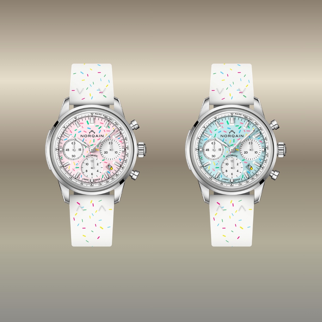 NORQAIN è lieto di presentare il Freedom Chrono Enjoy Life “Sprinkles”, un nuovo e vibrante capitolo della collezione. L’orologio esibisce un quadrante decorato con zuccherini multicolori, che esprime tutto il calore e l’ottimismo del marchio. Gli “sprinkles” di zucchero non sono solo un elemento estetico, ma simboleggiano l’importanza di trovare gioia anche nei momenti più difficili. Come accade quando un gelato è reso speciale dal topping, queste note allegre sono pensate per regalare un sorriso e ricordare che la vita va vissuta pienamente.