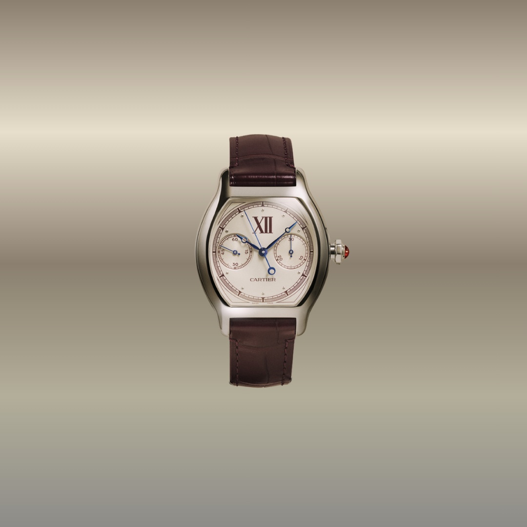 Il Tortue Cronografo Monopulsante reinterpreta un modello Cartier del 1998 della Collection Privée, riprendendone i codici estetici: numeri romani XL, indici perlati, minuteria chemin de fer e dettagli triangolari agli angoli del quadrante.