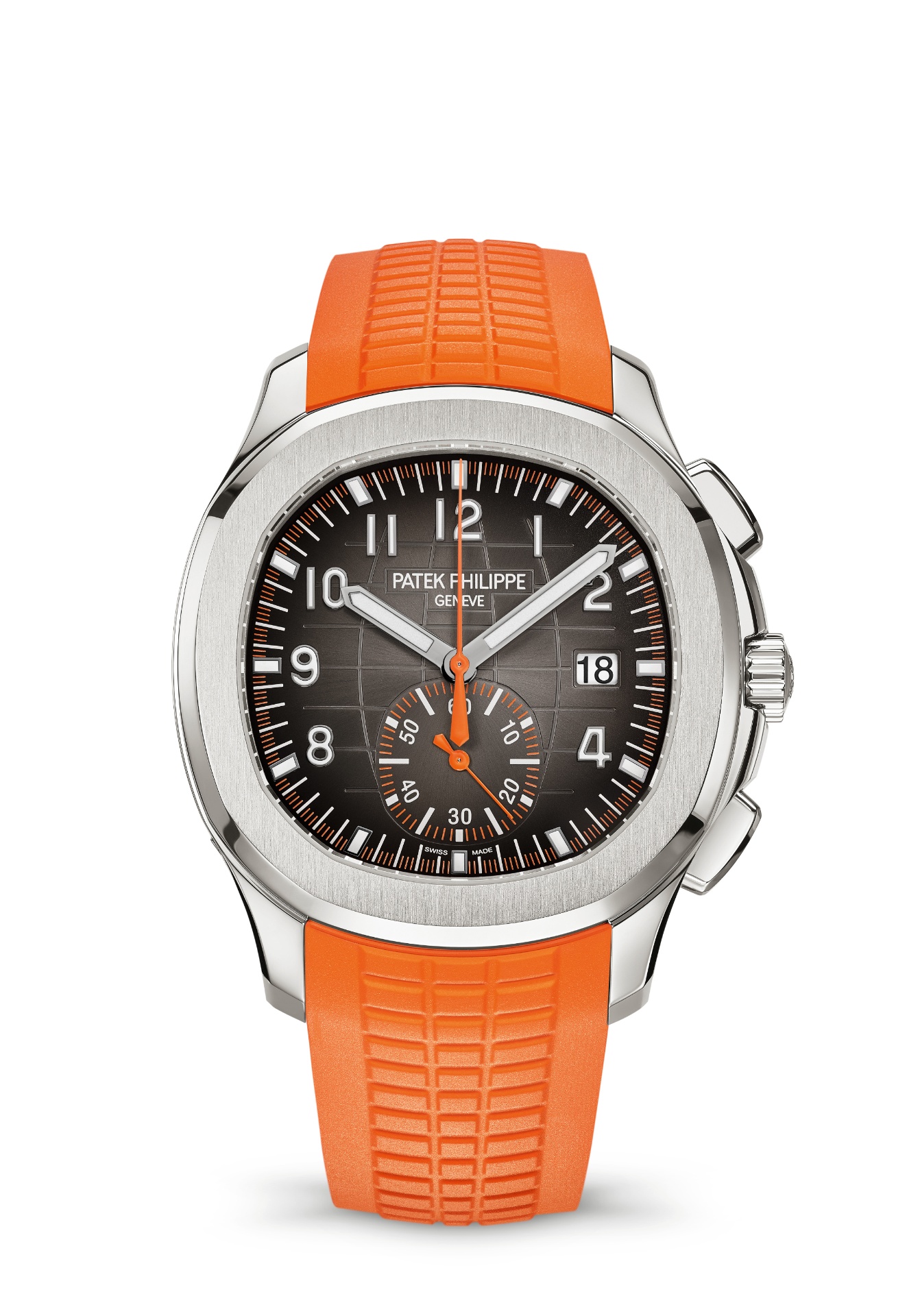 La collezione contemporanea Aquanaut, sportiva ed elegante, accoglie il primo cronografo, una complicazione perfettamente nello spirito di questa linea giovane e dinamica. La Ref. 5968 con movimento cronografo flyback a carica automatica colpisce anche per la sua estetica fuori dal comune, dove le indicazioni del cronografo arancio si stagliano sullo sfondo nero del quadrante. Patek Philippe consegna questo modello unitamente a due cinturini in materiale composito ultraresistente, nero e arancio.