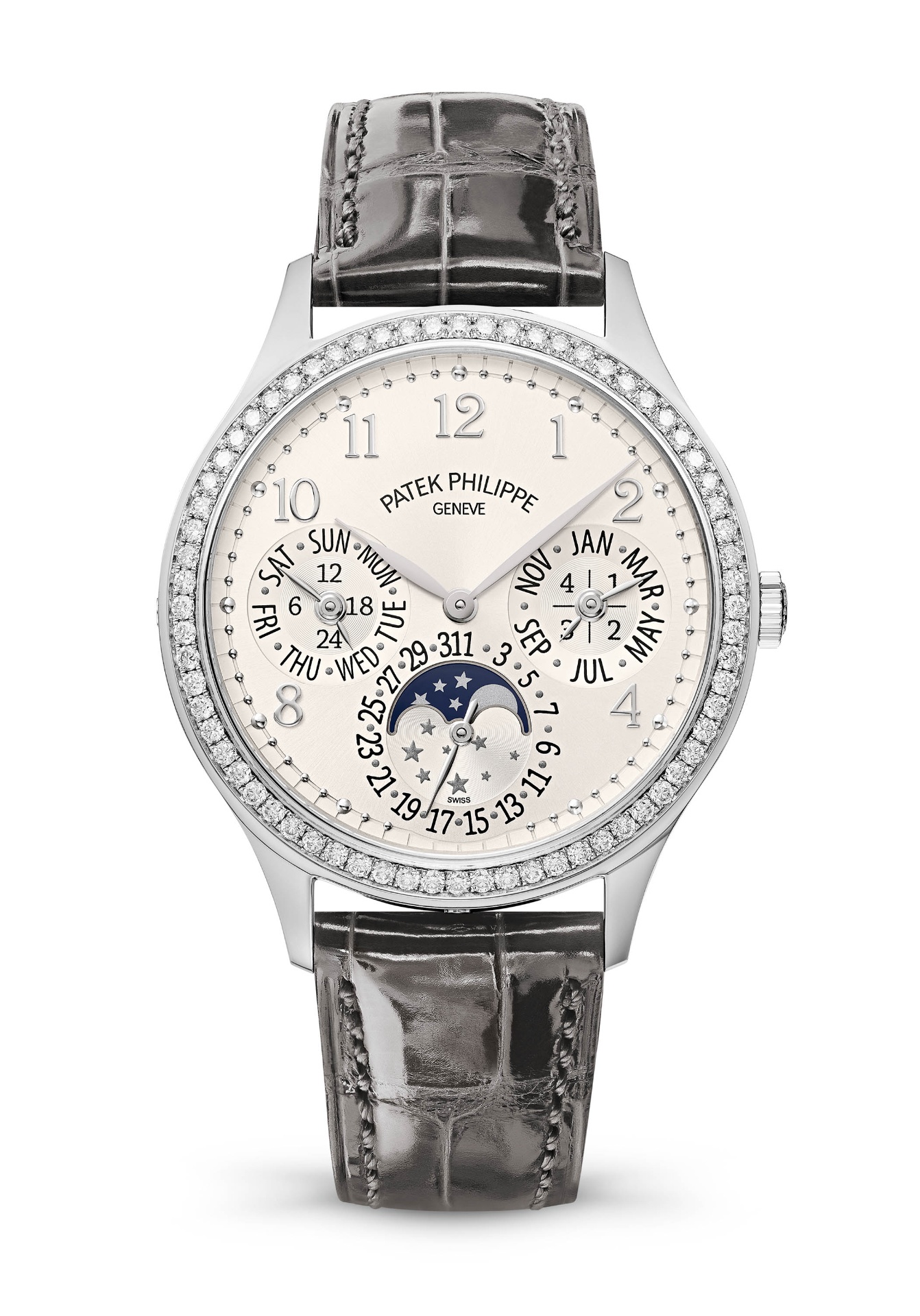 Il calendario perpetuo ultrapiatto automatico per signora Ladies First Perpetual Calendar adotta l’oro bianco in una nuova versione che va ad aggiungersi a quella in oro rosa. La lunetta con diamanti incastonati illumina il quadrante argenté soleil con cifre e minuteria applicate in oro. Una grande complicazione all’insegna della femminilità.