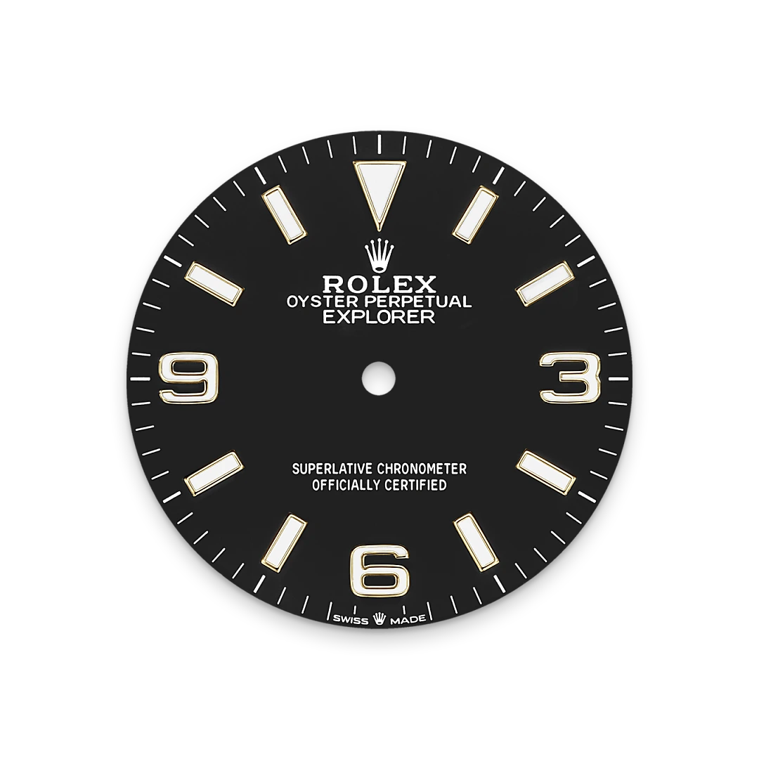 The dial is the distinctive face of a Rolex watch, the feature most responsible for its identity and readability. The Explorer model’s characteristic 3, 6 and 9 numerals are filled with a luminescent material emitting a long-lasting blue glow, like the hour markers and hands. Like all Rolex timepieces, the Explorer 36's dial is designed and manufactured in-house, largely by hand to ensure perfection.