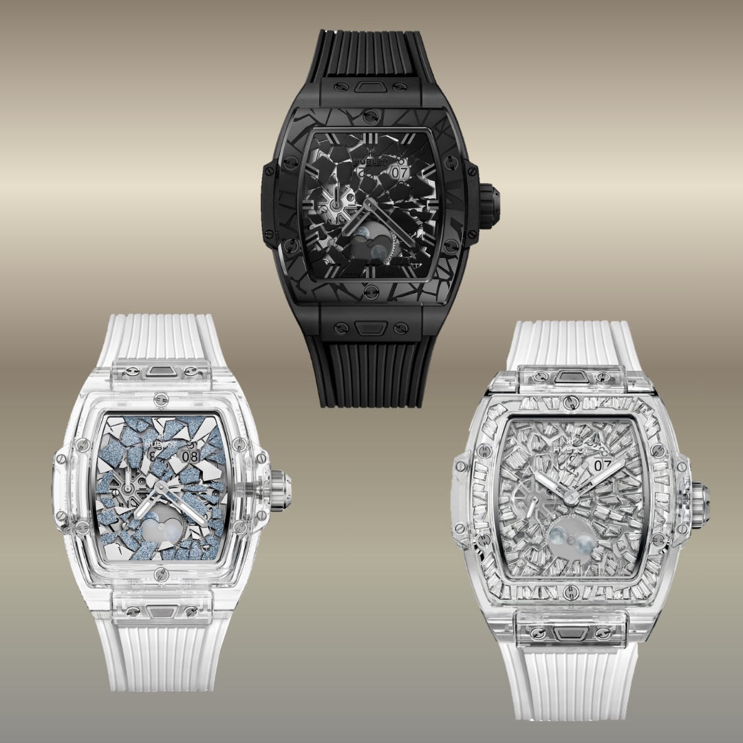 Gli Spirit of Big Bang Impact nelle versioni All Black, Sapphire e Sapphire Jewellery sono orologi di alta orologeria dal design tonneau scheletrato. La versione All Black combina ceramica nera e look tecnico e aggressivo, la Sapphire esalta la trasparenza con cassa e vetro in zaffiro per mostrare il movimento interno, mentre la Sapphire Jewellery aggiunge diamanti, trasformando il segnatempo in un pezzo di alta gioielleria. Tutte condividono movimento automatico scheletrato e un’estetica futuristica basata su materiali innovativi e lusso estremo.