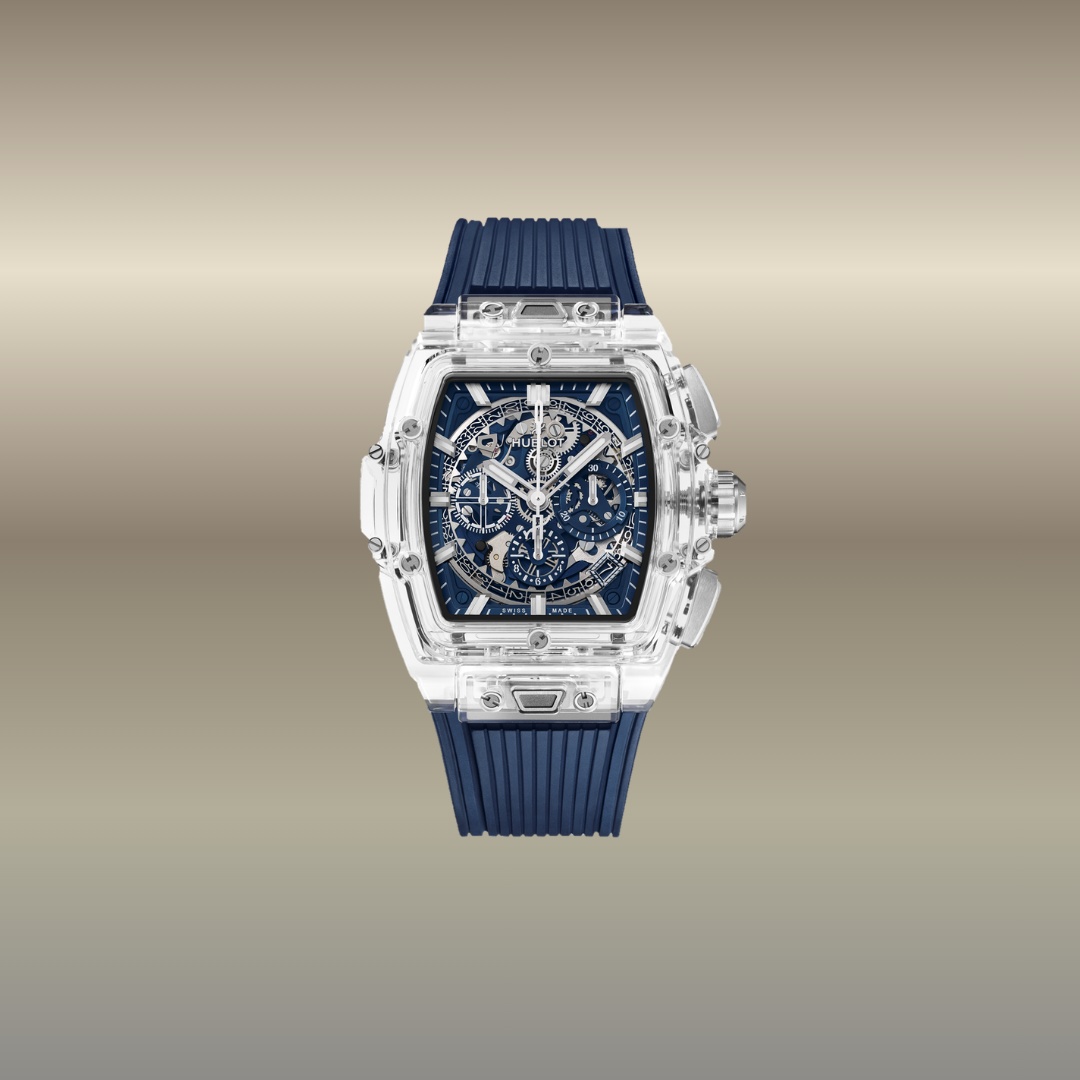 Il modello Sapphire Blue è un cronografo di alta orologeria con cassa in zaffiro blu trasparente che mette in risalto il movimento scheletrato interno. Combina design futuristico, materiali innovativi e forte impatto estetico, risultando un segnatempo di lusso molto esclusivo e scenografico.