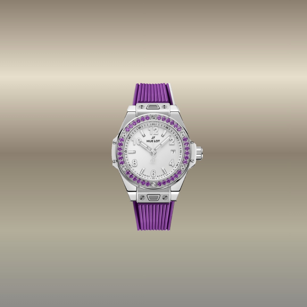 È un orologio da 33 mm in acciaio con lunetta decorata da pietre viola (ametiste), abbinato a un cinturino in caucciù. Il design è elegante e colorato, tipico della linea Joyful, che unisce stile gioielliero, sportività e un’estetica femminile moderna, con movimento automatico e spirito luxury casual.