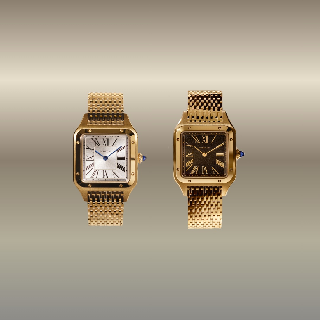 I nuovi Santos-Dumont mettono in scena due interpretazioni complementari della stessa idea di raffinatezza Cartier: da un lato la dimensione più sensoriale e materica, con il quadrante in ossidiana dorata sottilissimo e riflessi iridescenti, accompagnato da un bracciale in oro giallo composto da 394 maglie che richiama la tradizione dei primi bracciali su misura della Maison; dall’altro lato, Cartier spinge invece sull’evoluzione dell’icona attraverso il bracciale, reso estremamente flessibile e quasi fluido, capace di aderire al polso come un tessuto metallico prezioso. In entrambi i casi, Cartier lavora sulla stessa grammatica estetica: trasformare la tecnica in sensazione, e la struttura in esperienza, riaffermando l’orologio non solo come oggetto funzionale ma come forma viva, in equilibrio tra memoria, materia e movimento.
